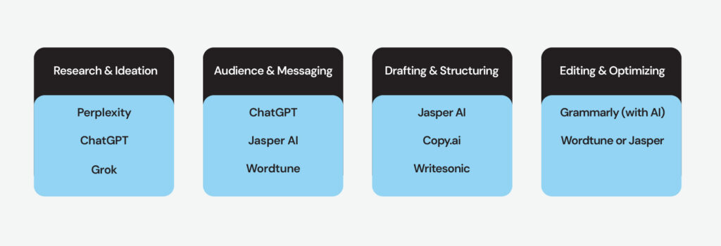 To better understand how these AI writing assistants function in practice, let’s connect them to the main pillars of the copywriting workflow. These are: