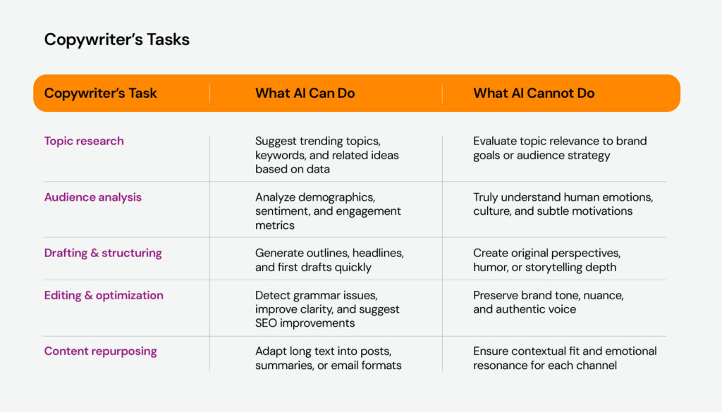 And here’s a summary of the key copywriter’s tasks and what AI can/cannot do in this regard: