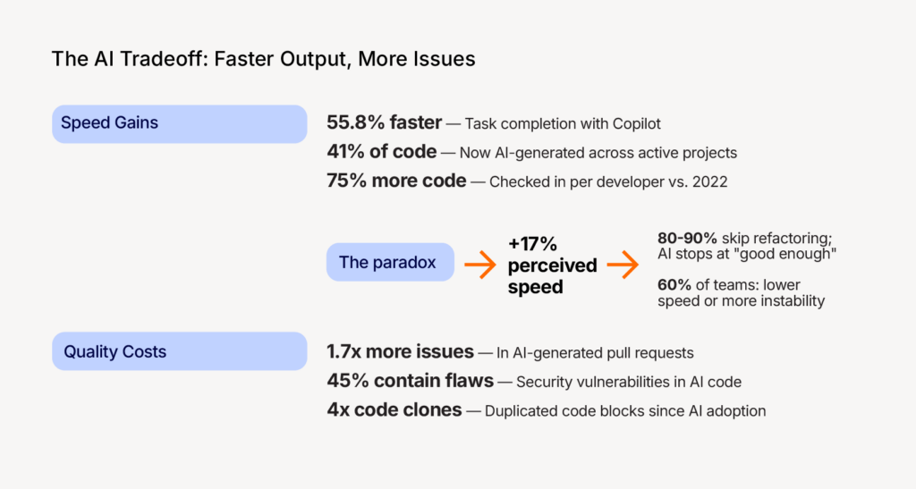 AI-powered software development delivers speed gains that are real, well-documented, and too valuable to ignore. Developers are producing more code, completing routine tasks faster, and spending less time on the mechanical parts of software engineering.