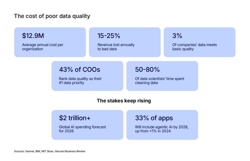 The financial picture is bleak. A study by MIT Sloan and Cork University Business School found that companies lose between 15% and 25% of their revenue annually due to poor data quality. Gartner puts the average annual cost at $12.9 million per organization. And those figures predate the current wave of generative AI adoption. With global AI spending forecasted to surpass $2 trillion in 2026, the exposure is getting larger.